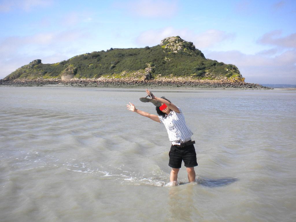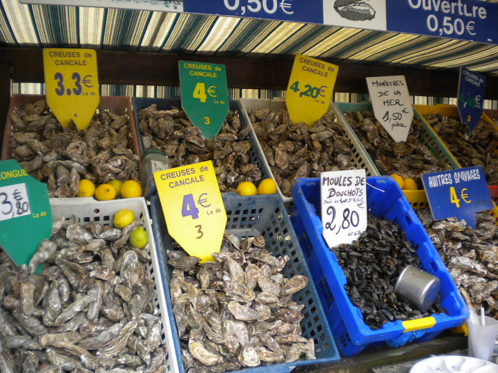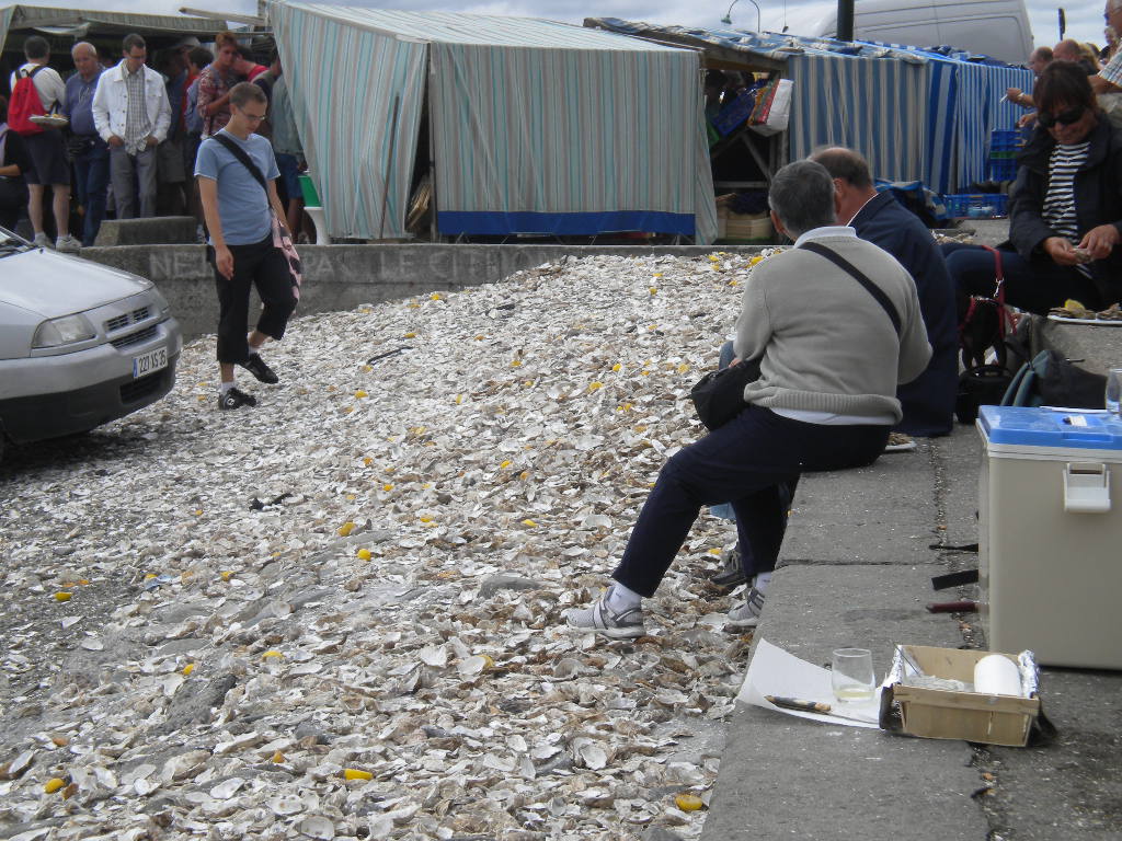 カンカルは牡蠣の養殖で有名な街。 かのナポレオンがここの牡蠣がお気に入りだったことで有名になったとか。 モンサンに3泊するのは決めてたけど、特に予定はなし。 そこでAtsueさんに相談したら、「牡蠣食べに行こう!」ということになった。 わたしと連れとAtsueさんと,そしてAtsueさんのルームメイトのMちゃんで出発。 モンサンからは車で40分くらい。 カンカルに着いて海辺に向かうと、ありますあります、牡蠣の直売所。 屋台風な簡単な売り場がいくつも並んでいる。 その中から好きな店を選んで、好きな種類の牡蠣を購入。 その場で食べる人がほとんどなので、売り場の人がちゃんと口を開けてくれて、レモンも添えてくれる。 値札は12個の値段。 6個でも購入できたけど、ちょっと割高になった。 こうやってお皿に盛ってくれて、みんなそこら辺に座って食べる。 「お皿は店に返してね。殻はそこら辺に捨てていいよ。レモンは捨てないで!」ということで、 あたり一面こんなことになっている。 (レモンを捨ててはいけません!) Mちゃんはカンカルに来るのは2度目ということで、本日のガイドさん。 ガイドさんの助言に従って、来る途中でワインを購入! 「すぐ飲みます」と言うと、コップをつけてくれる この白ワインがキリっと辛口で、さらに良く冷えてておいしい! そこに、開けたばかりの牡蠣にレモンを絞って、ちゅる!!っと。 あ~、幸せーーーー!!!! わたしは一時期、生牡蠣恐怖症だったのだが、フランスの牡蠣は品質・衛生面共にかなり厳しく検査されていると聞いたことがあったので、夏でも安心していただきました。 ちなみにわたしの連れ、牡蠣が嫌いで食べられない。 喜んで食べてるわたしたちを、変人を見るような目つきで眺めてた。 こんなに美味しいのに、もったいなーい。 カンカルから、遠~くにモンサンが見える。 見える?