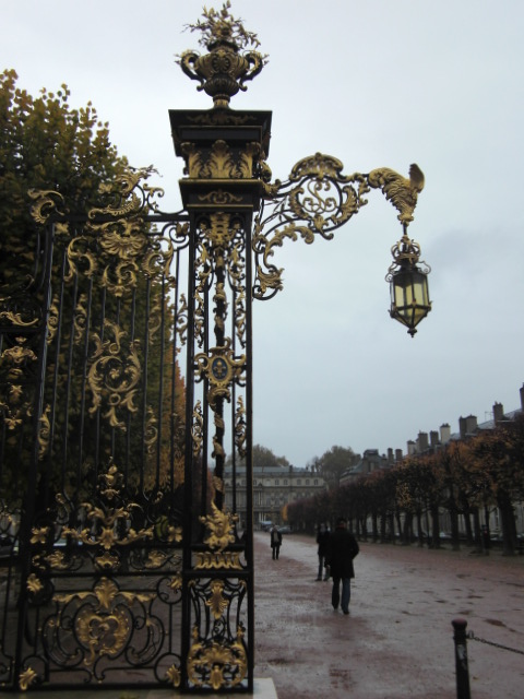 が、なかなか思うとおりに行かず、かなり疲れてしまいました。。 まず、頼みの綱の「地球の歩き方」を忘れていった! デジカメのメモリーカードをパソコンに挿しっぱだった! ずっと雨に降られた! 日曜日でお店が早く閉まってしまい、買おうと思ってたマカロン・ド・ナンシーが買えなかった! 帰りの電車に乗り遅れた! やっと乗れた電車が、どっかの駅でずっと止まってて、到着がだいぶ遅れた! 状況が全く分からず、ほんとにストラスブールに着くのか心配でたまらず、ずっとドキドキしっぱなしだった…。 こうやって書くと、散々な感じだけど、それでもまあ楽しかったかな? ガイドブックによると、ナンシーはアールヌーボーが生まれた地らしい。 ガレやドーム兄弟のガラス工芸品が大好きなので、絶対に行こうと思ってた。 ストラスブールからは急行で1時間30分くらい。 最大の目的地のナンシー派美術館に向かうつもりだったけど、ガイドブックを忘れたため、まずは観光案内所に向かう。 観光案内所は、ナンシーの最大の見どころであるスタニスラス広場に面してます。 とりあえず、標識にそってスタニスラス広場を目指したんだけど。 広場の門が見えた途端、思わず 「おぁー…」 とアホみたいな声が出た。 ガイドブックの写真で見てたけど、これはすごい。 すごい金ピカ。 こんなん。(これはちょっと違う場所のだけど) 広場に通じる道が何本かあって、そのすべてに同じような金ピカの門が。 中はかなり広い。 門のほかには、角にはこんなものが。 あと街灯も金ピカでした。 とりあえず写真を撮って満足し、すぐ隣の観光案内所へ。 地図と美術館の案内をもらう。 外に出ると、雨が結構強くなってきたので、雨宿り&これからの計画を立てるため、広場に面したレストランに入ってみた。 ついでに腹ごしらえ。 ロレーヌに来たんだからこれを食べなきゃ! と、注文したのが キッシュ・ロレーヌです! なかなか美味かった! けど、かなり高い。 キッシュと野菜スープと食後にエスプレッソで16ユーロ。 観光地のレストランだし、仕方ないのかなとは思うけど。 そして、キッシュもスープもとんでもなくデカかった。 広場の豪華さに合わせて、お店もかなり雰囲気が良かったけど、料理やサービスはそこそこ。 というか、内容はレストランというよりカフェ?苦笑 キッシュが来て写真を撮ってたら、隣の席に座ってたムッシューと目が合って、「Bon appetit!」 と言ってくれた。 フランスの、こういう気軽に声をかけられる雰囲気が大好き。